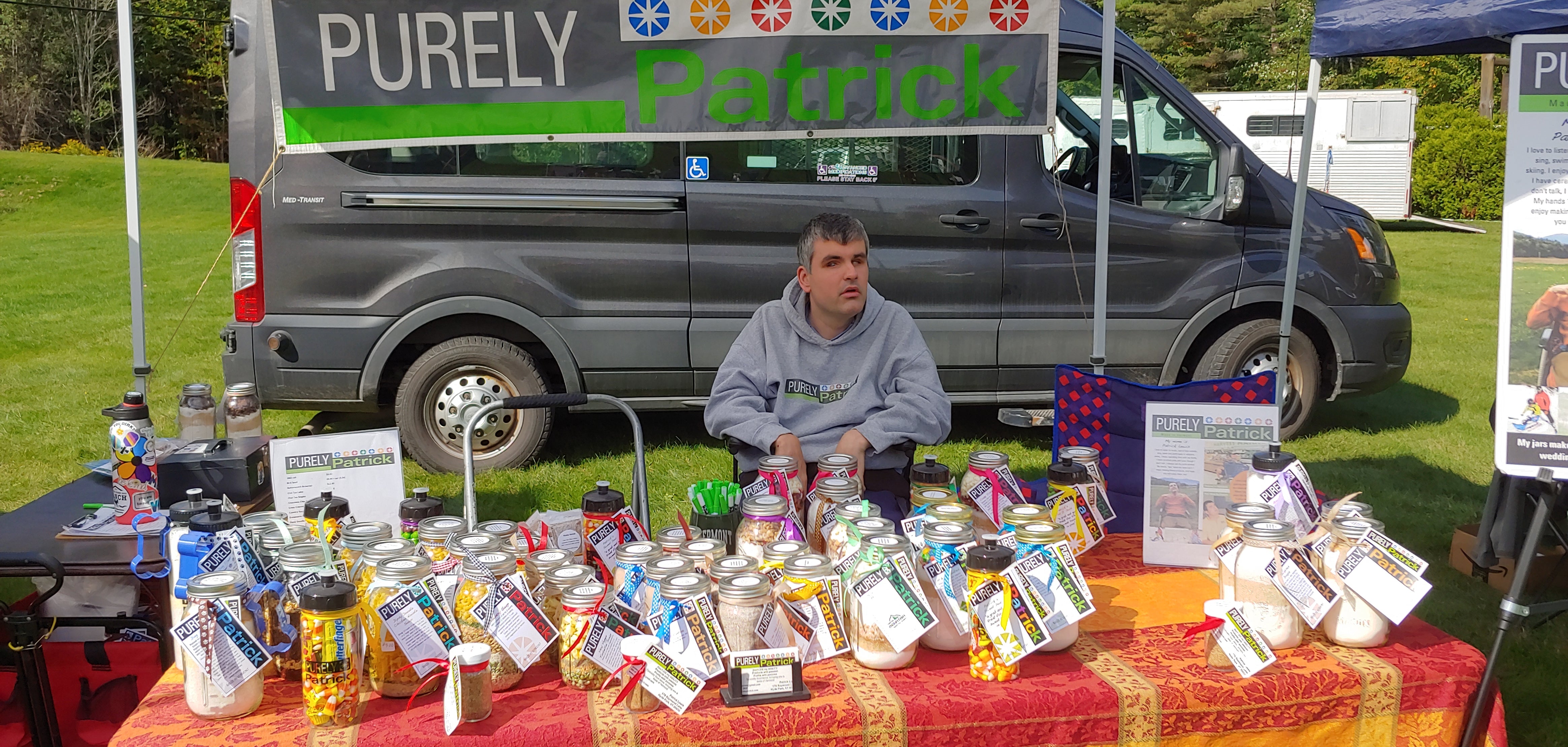 Patrick has been busy with self-employment since graduating high school in 2011. With the help of his mom (who happens to be an O.T.), his business model, "Purely Patrick" was developed. Patrick uses assistive technology to make dry ingredients mixes for you to make at home such as cookie mixes, soup starters, breads, dog treats, chai and more. Patrick has a job coach who helps ensure the ingredients are measured correctly. Patrick not only enjoys making these goodies for you, he loves to go to the grocery store to buy the ingredients. He thoroughly enjoys the interactions at the Farmer's Markets and craft shows where he sells his goodies in his home state of Vermont.